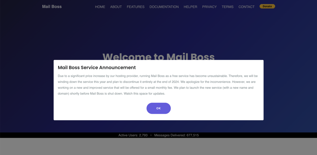 This was a solution years ago, but now in June 2024, when you access their website you’re slapped with a big fat notice that explains everything: “Due to a significant price increase by our hosting provider, running Mail Boss as a free service has become unsustainable. Therefore, we will be winding down the service this year and plan to discontinue it entirely at the end of 2024. We apologize for the inconvenience. However, we are working on a new and improved service that will be offered for a small monthly fee. We plan to launch the new service (with a new name and domain) shortly before Mail Boss is shut down. Watch this space for updates.“