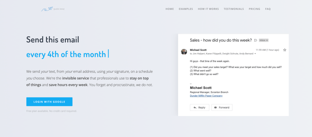 This is another simple service that helps send recurring emails, so very similar to Recurrr.